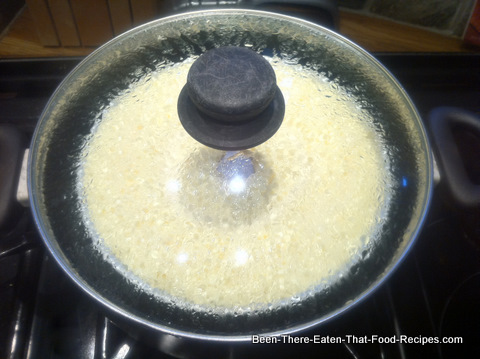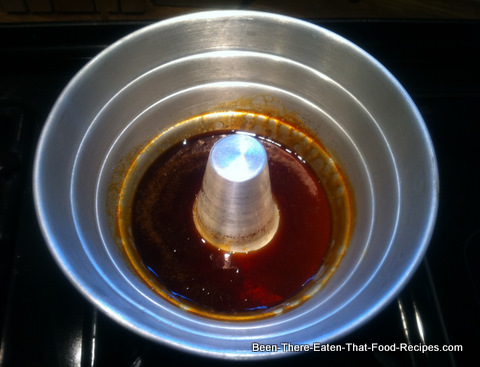 If you are using the pan-lid bain marie, place the pan on the medium heat now and add about 2cm of water to set the bain-marie. Place the mould with the caramel inside the pan with the water, and keep them on medium heat.